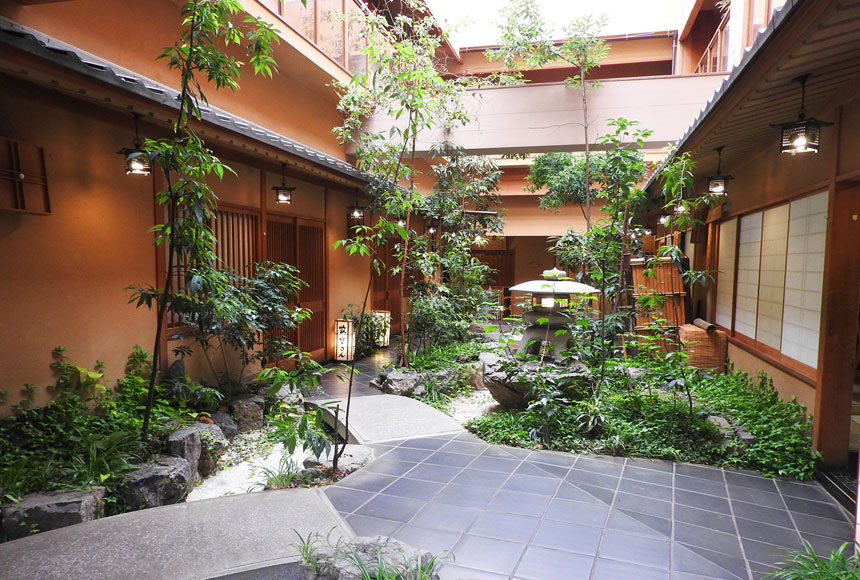 吹き抜けからの暖かい日差しが美しい中庭を照らし出し、日本の美が広がります。