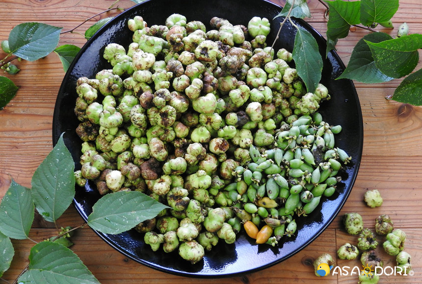 乾燥した状態。乾燥した虫癭果(ちゅうえいか)は、木天蓼(もくてんりょう)と呼ばれています。(左下)