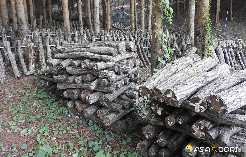 一定の長さに切断した「榾木(ほだ木)」を用い、山林で育てる野生に近い栽培方法です。