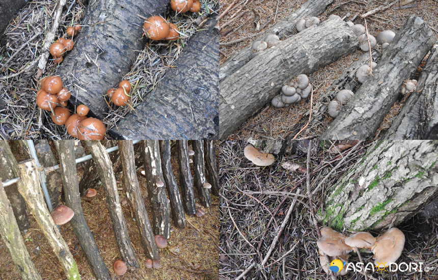 左上より時計回りに「原木なめこ」、「原木ひらたけ」、「原木むきだけ」「原木しいたけ」。